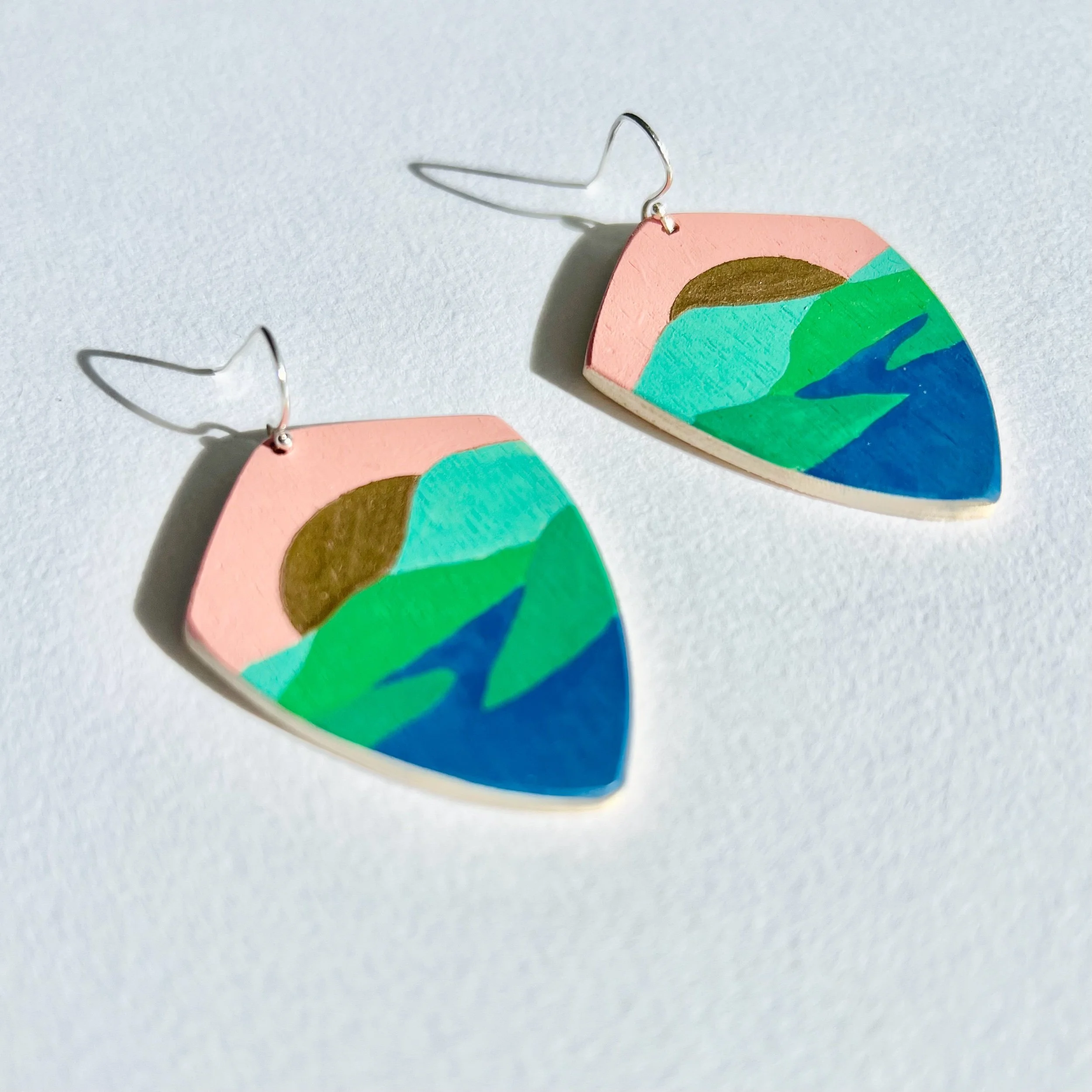 This pair of earrings measures approximately 2.5 inches long from the top of the top ear piece to the bottom edge of the dangle. I hand cut it from very light weight 5-ply baltic birch plywood. The earrings are then sanded to 150 grit and hand painted with zero-VOC wood wax and gold oil paint. The 6mm long ear post and disc is 100% sterling silver, and has been attached to the back of the wood earring with industrial strength jeweller’s epoxy.Each earring weighs approximately 2 grams including the backing. If you are familiar with my leather earrings, they are as light and in some cases lighter than those.
