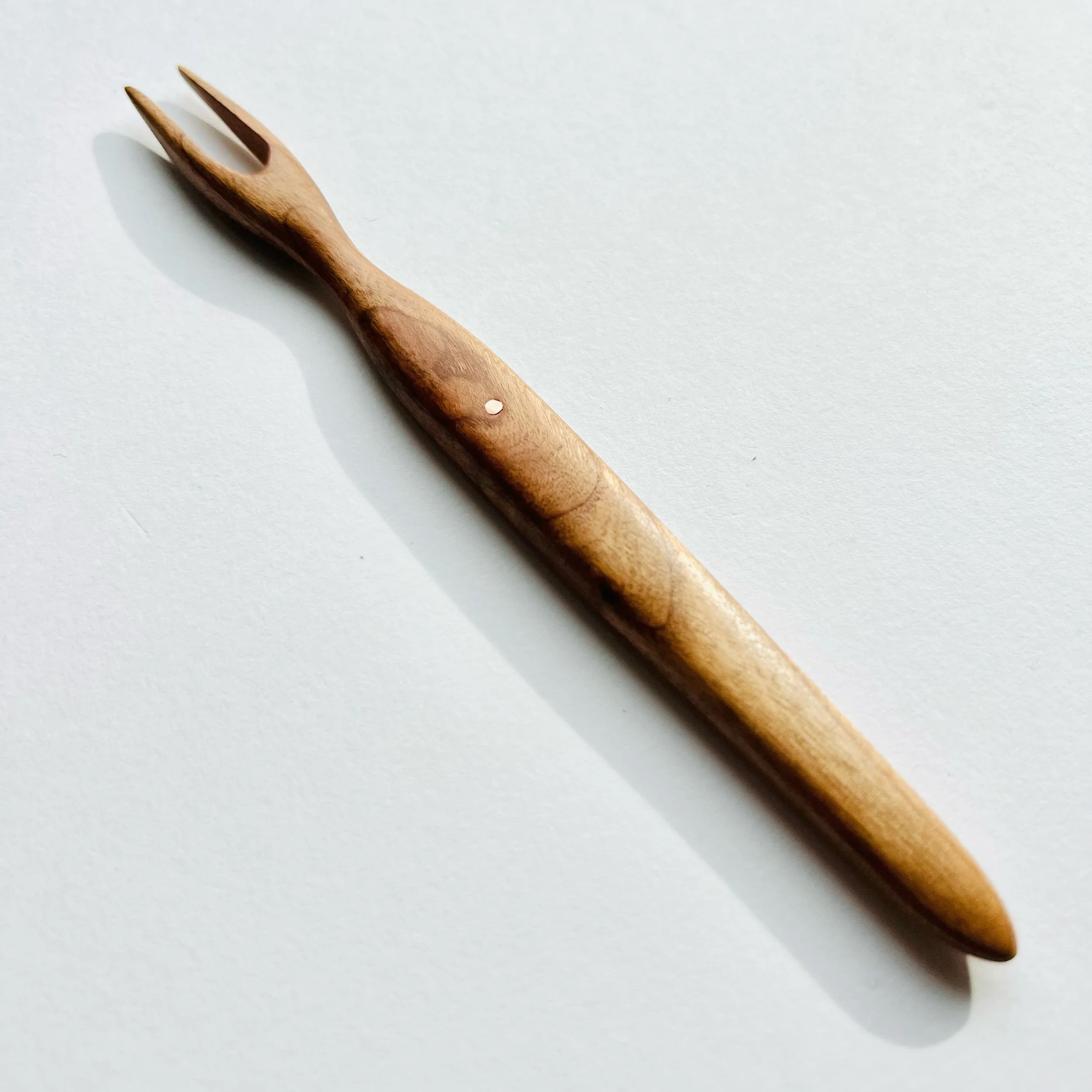 These hors d'oeuvres forks are made from the tiniest wood scraps that even the most stingy wood worker would burn. We cut the organic shape by following each scrap's grain pattern on a scroll saw. They are then rough shaped on the belt sander before being riveted with a decorate piece of solid copper, recycled from electrical wiring, which is carefully hammered into the stem of the fork. The forks are progressively refined through multiple sanding grits to their final form. The sharp tines are hand filed and sanded to a silky smooth and spear-worthy finish. Once done, we sun tan them until the cherry deepens to its final deep rose hue. As with all our wooden utensils, these are de-whiskered, re-sanded and polished with superfine steel wool between coats of food safe finish to create a satiny smooth and durable finish.